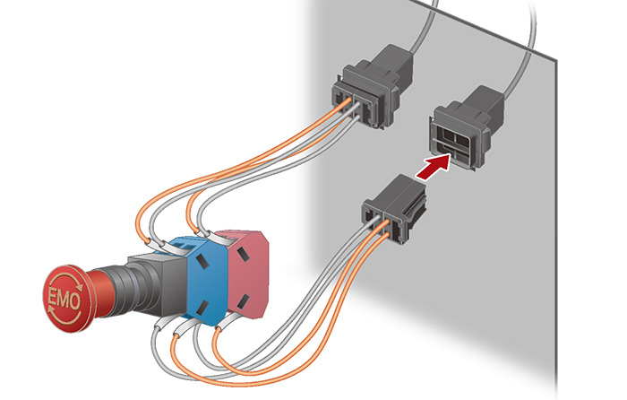 For equipment design engineers, IDEC offers smart solutions. Our switch solution uses a wiring harness to drastically reduce wiring time. By attaching a male connector on the wiring side and a female connector on the terminal block side (previously a screw mount), the wire can be quickly attached and removed even in tight spaces. This design for switch wiring reduces the burden on equipment designers, and cuts downtime during parts replacement work.