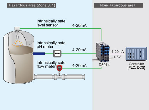 In equipment used in an explosive atmosphere, the wiring that transmits information from sensors and safety devices to the controller is seen as the main ignition source. Lowering the current or voltage and keeping it below a certain level prevents the wiring from becoming a source of ignition, preventing explosions.