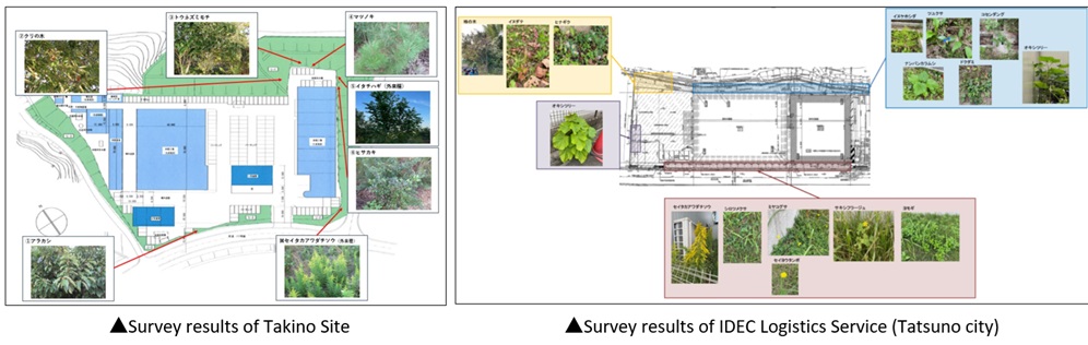Hoping to contribute to environmental conservation by understanding the impact on the local ecosystem around business sites, members of the business sites took the lead in conducting a wildlife survey around the head office, Takino, Fukusaki, Amagasaki, and IDEC Logistics Service (Tatsuno City). We also received advice from an external inspection organization for SEGES' "Fostering Green" certification, which was acquired by our headquarters in FY2024, and eradicated invasive species (such as Solidago altissima) to prevent damage to the ecosystem.