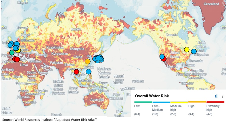 The following is the world map that shows Aqueduct overall water risk per each IDEC site. Among 19 sites, four sites (each one site in USA and Thailand and two sites in Tunisia) were assessed as extremely high water risk, and one site in China was assessed as high water risk.