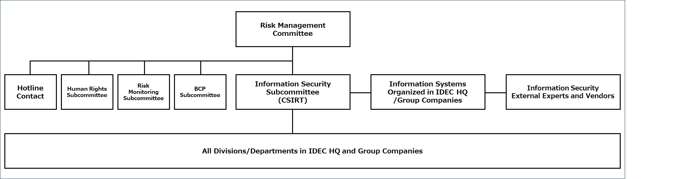 The Information Security Subcommittee was established within the Risk Management Committee, a specialized committee of the Sustainability Committee, to oversee information security management for the entire IDEC Group. The Information Security Subcommittee identifies the information assets of the entire IDEC Group and conducts risk assessment. Based on the results of these assessments, the subcommittee works with the various information security management organizations of each IDEC Group company and their supervisors on a global basis.