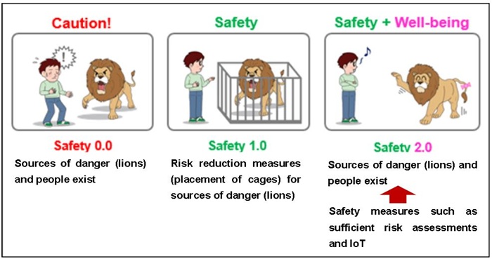 In “Safety1.0,” dangerous lions are enclosed in cages and kept away from people to ensure safety, but risks as irregular conditions, such as for work performed after entering enclosures, remain.