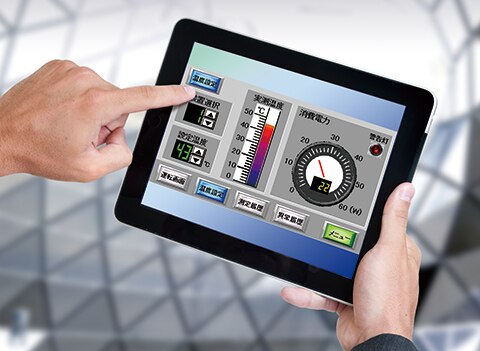 IDECの「HG1G形プログラマブル表示器」は、IoT時代に最適なHMIです。 FTP サーバー機能に対応しているため、表示器のデータをアップすることで、必要なメンバー間で情報を共有することができます。また、モバイル端末やパソコンから遠隔操作できるので、いつでも状況確認ができ、非常時の迅速な対処にも貢献します。