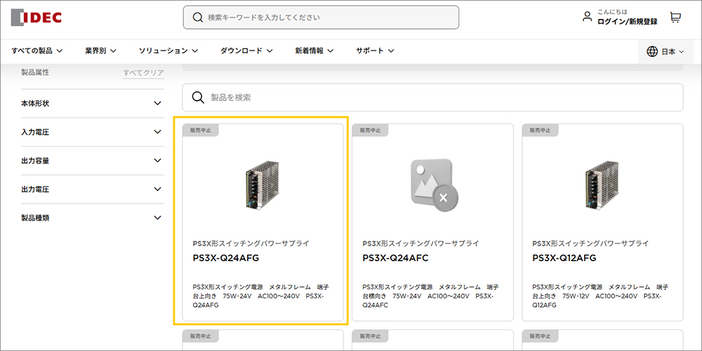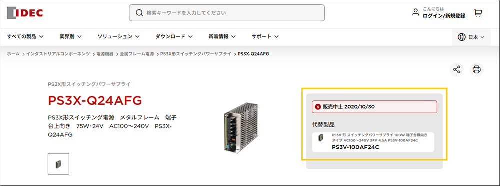 ⑤各製品ページでは、販売中止の日付や推奨代替品をご確認いただけます。(一部例外あり)