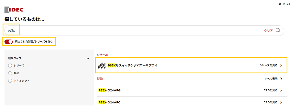 ③「廃止された製品/シリーズを含む」にチェックを入れ、検索窓に製品名またはシリーズ名を入力します。