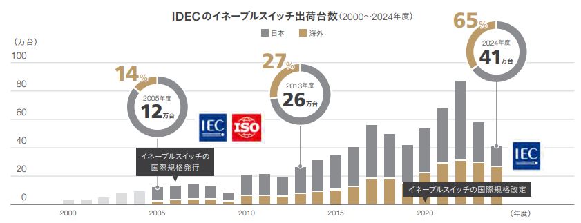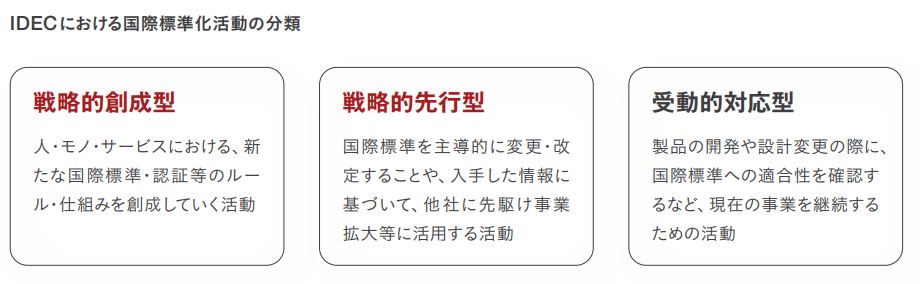 1960年代から1990年代までは、主にルールを活用することで市場を 拡大してきましたが、1990年代からはIEC(国際電気標 準会議)やISO(国際標準化機構)の専門委員会に積極 的に参画し、グローバル社会における、新たな技術開発に対応した国際安全規格づくりを提案、推進するなど、 IDEC自身がルールを形成していく活動を積極的に行っ ています。