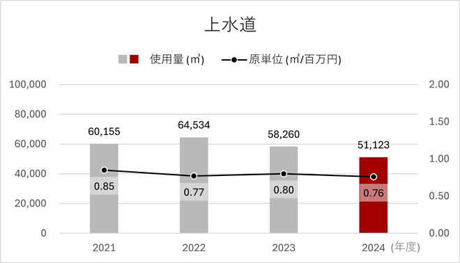 | 上水道使用量(m3)/売上高原単位(m3/ 百万円) | 連結 | 64,534 / 0.77 | 58,260 / 0.80 | 51,123 / 0.76 |