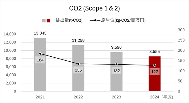 | 自社CO2排出量(t)/売上高原単位(kg-CO2 / 百万円) | 11,298 / 135 | 9,590 / 132 | 8,555 / 127 | |