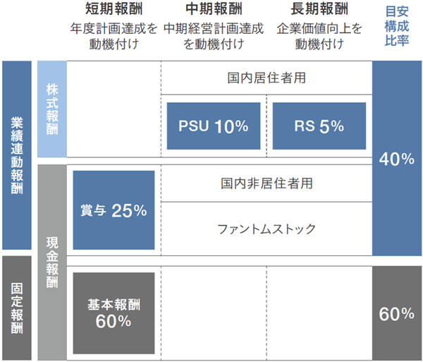 株式報酬は中期インセンティブとしてのパフォーマンスシェアユニット(以下、PSUという)および、長期インセンティブとしての譲渡制限付株式報酬(以下、RSという)により構成する。役位に応じて算定した株式ユニットおよび普通株式(譲渡制限を付したもの)を毎年、一定の時期に割当てる。