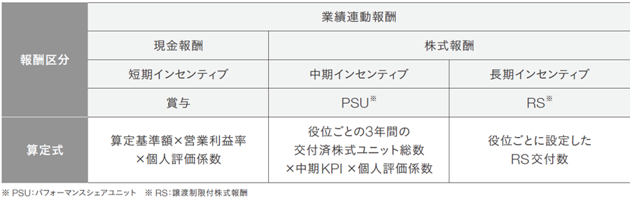 ・PSUの算定に用いるKPIは財務指標として中期経営計画で掲げた目標の達成度合い、非財務指標としてESGに関する目標の達成度合いおよび、管掌部門の業績等に関する人事評価(役付取締役を除く)とする。