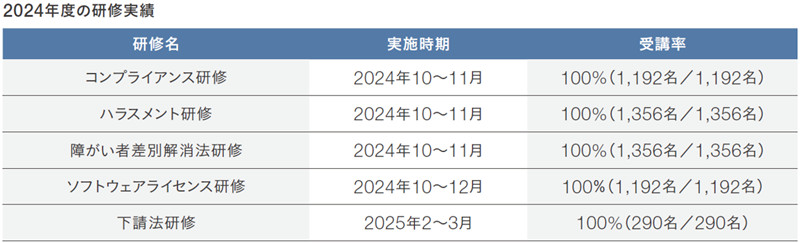 2024年度は、本社および国内グループ会社の従業員を対象に「ハラスメント研修」と「コンプライアンス研修」を実施しました。コンプライアンスの個別テーマとして、下請取引に関連する従業員を対象に「下請法研修」を実施し、実務上で必要な義務や禁止事項について認識を深めました。