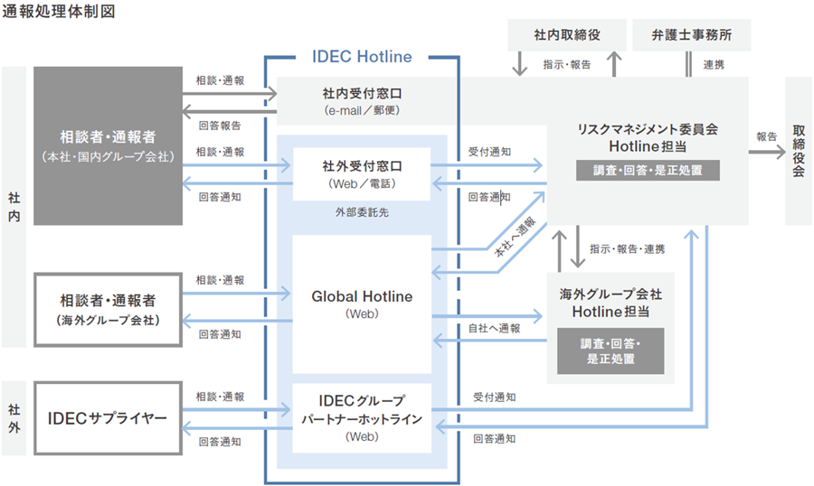 「IDEC Hotline」を設置し、利用者の状況に合わせて「社外 窓口/社内窓口」「匿名/顕名」での通報が可能な仕組みを構 築しています。内部通報運用規程を定め、相談・通報の秘密を 守るとともに、利用者への不利益な取り扱いを禁止しています。通報があった際は、リスクマネジメント委員会内に設置された「Hotline担当」が迅速に対処し、解決と再発防止策を図ります。また通報は速やかに経営層へ通知されるとともに、定期的に取締役会に報告してリスク情報の共有を図る一方、経営層の関与がある場合などは 状況に応じて独立性を確保し、外部の弁護士事務所と 連携するなどの仕組みとしています。