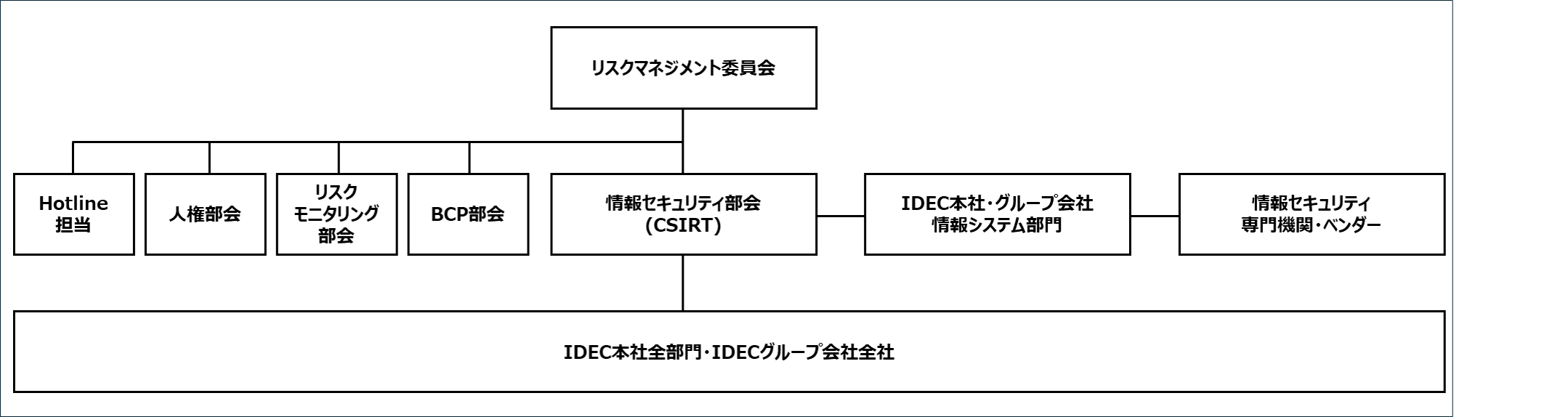 サステナビリティ委員会の専門委員会であるリスクマネジメント委員会内に情報セキュリティ部会を設け、IDECグループ全体の情報セキュリティ管理を統括しています。情報セキュリティ部会は、IDECグループ全体の情報資産を特定した上でリスク評価を実施し、この評価結果に基づき、IDECグループ各社の情報セキュリティ管理組織およびその責任者と連携しグローバルに展開しています。