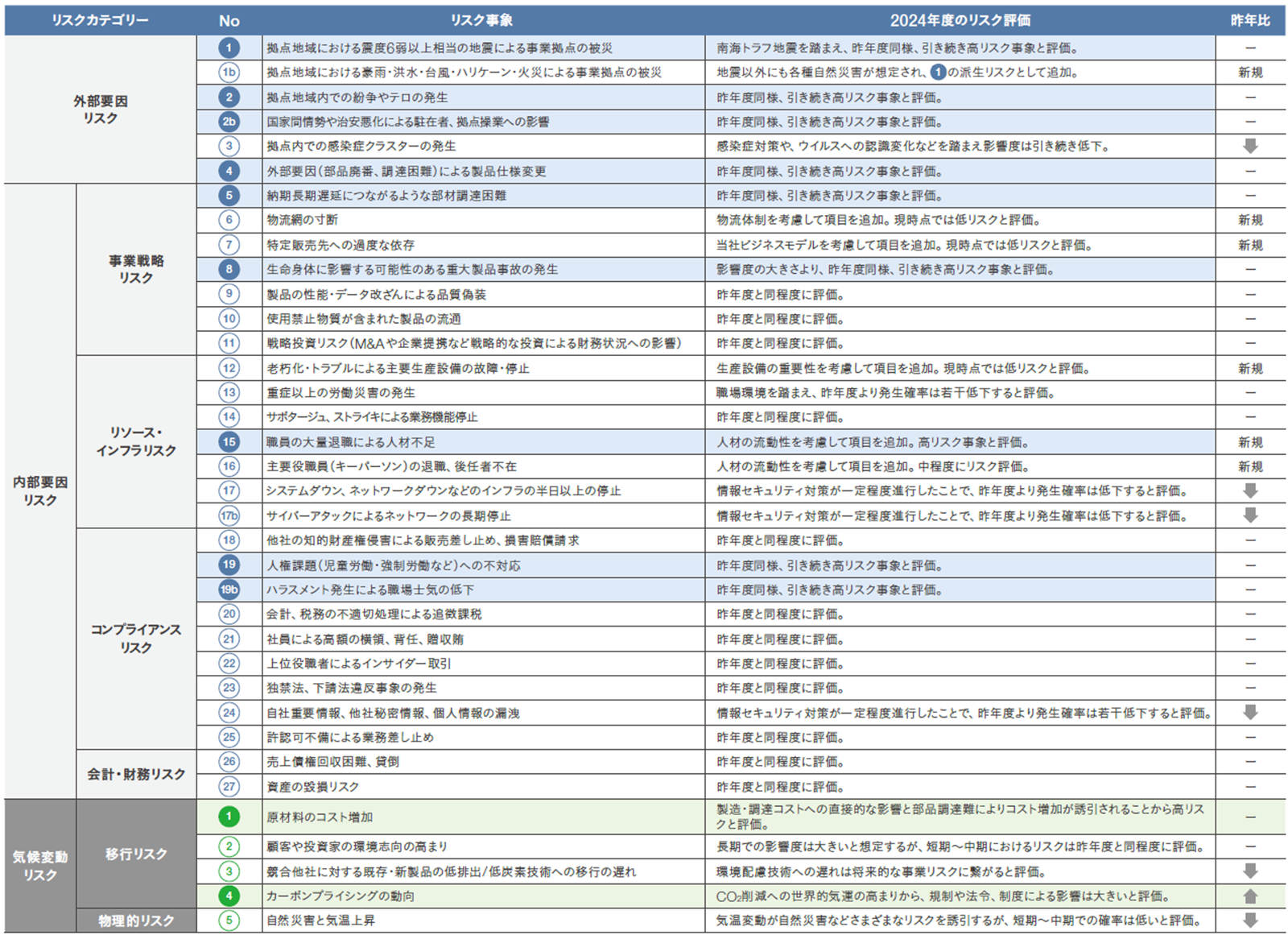 | 拠点地域内での紛争やテロの発生(上記表・マップ中のリスク No.2)、国家間情勢や治安悪化による駐在者、拠点操業への影響(上記表・マップ中のリスク No.2b) | グローバルに事業を展開する当社グループにおいて、国家間情勢の大幅な変動、拠点地域内での紛争やテロ、またそれに準じるデモや抗争により、社会や市場が混乱した場合には財政状況や事業展開に与える影響が大きいと考えております。 | 適時に情報を収集するとともに、地域分散などによりリスク回避を図っておりますが、リスクにつながる状況が発生した場合には、例えば紛争地域回避による輸送の遅延や輸送費の高騰などの課題テーマごとのタスクフォースを立ち上げ情報収集と対策を進めております。 |
