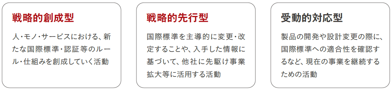 国際標準化活動を3つの分類で定義しており、専門部隊である「国際標準化・協調安全4次元推進部」を本社内に設置し、さまざまな活動を推進しています。