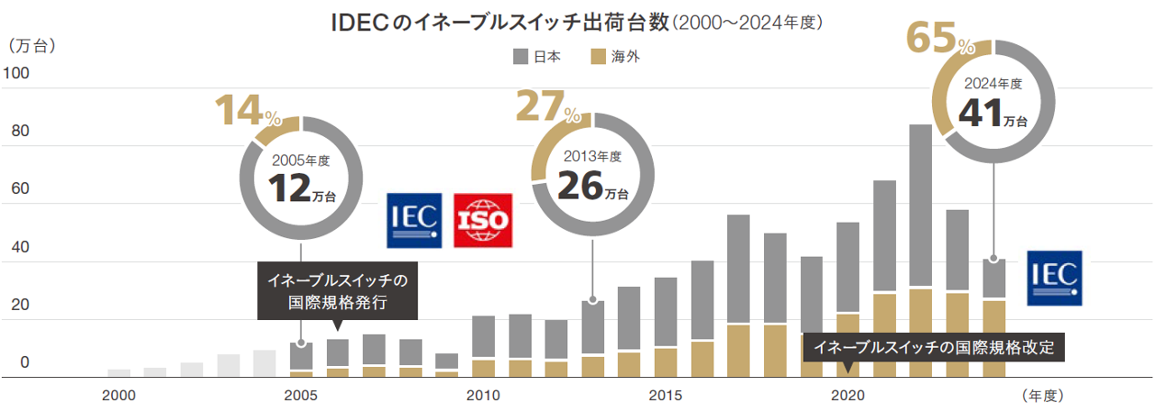 1960年代から1990年代までは、主にルールを活用することで市場を拡大してきましたが、1990年代からはIEC(国際電気標準会議)やISO(国際標準化機構)の専門委員会に積極的に参画し、グローバル社会における、新たな技術開発に対応した国際安全規格づくりを提案し、推進するなど、IDEC自身がルールを形成していく活動を積極的に行ってきました。
